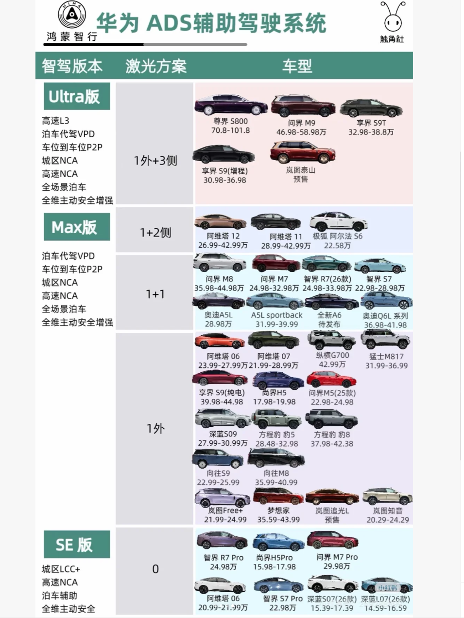 先看鸿蒙智行的“智驾版本梯队”卓信宝配资,不同车型的L3潜力差异悬殊。从曝光的配置表来看,华为ADS主要分为Ultra版和Max版,两者核心区别在于是否支持“高速L3”:Ultra版搭载“1外+3侧”激光雷达方案,明确标注支持高速L3、泊车代驾VPD等高阶功能,对应的车型多是高端旗舰,比如46.98万起的问界M9、32.98万起的享界S9T、70.8万起的尊界S800;而Max版虽有城区NCA、全场景泊车等功能,但未提及L3,像24.98万起的问界M7、35.98万起的问界M8等车型多属于此类。更入门的SE版(如尚界H5 Pro、深蓝L07),仅支持基础的城区LCC+和高速NCA。